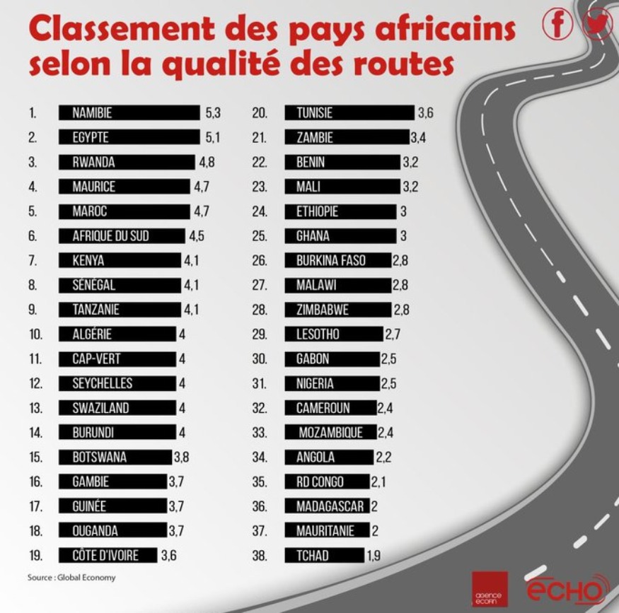 AFRIQUE 2050 : Selon Global Economy la qualité des routes en Afrique, Actualité Afrique 2050 23 août 2020