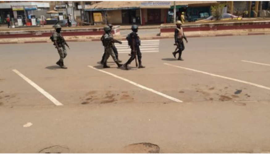 Des soldats camerounais dans les rues de Bamenda, dans la région anglophone, en février 2021. © Franck Foute/JA