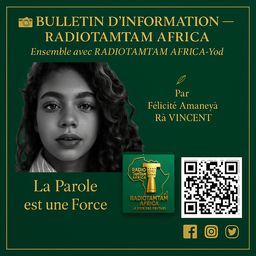 Bonjour et bienvenue dans votre bulletin d'information RADIOTAMTAM AFRICA, présenté par Félicité Amaneyâ Râ VINCENT, La Voix du Sud, le Pouvoir des Faits.