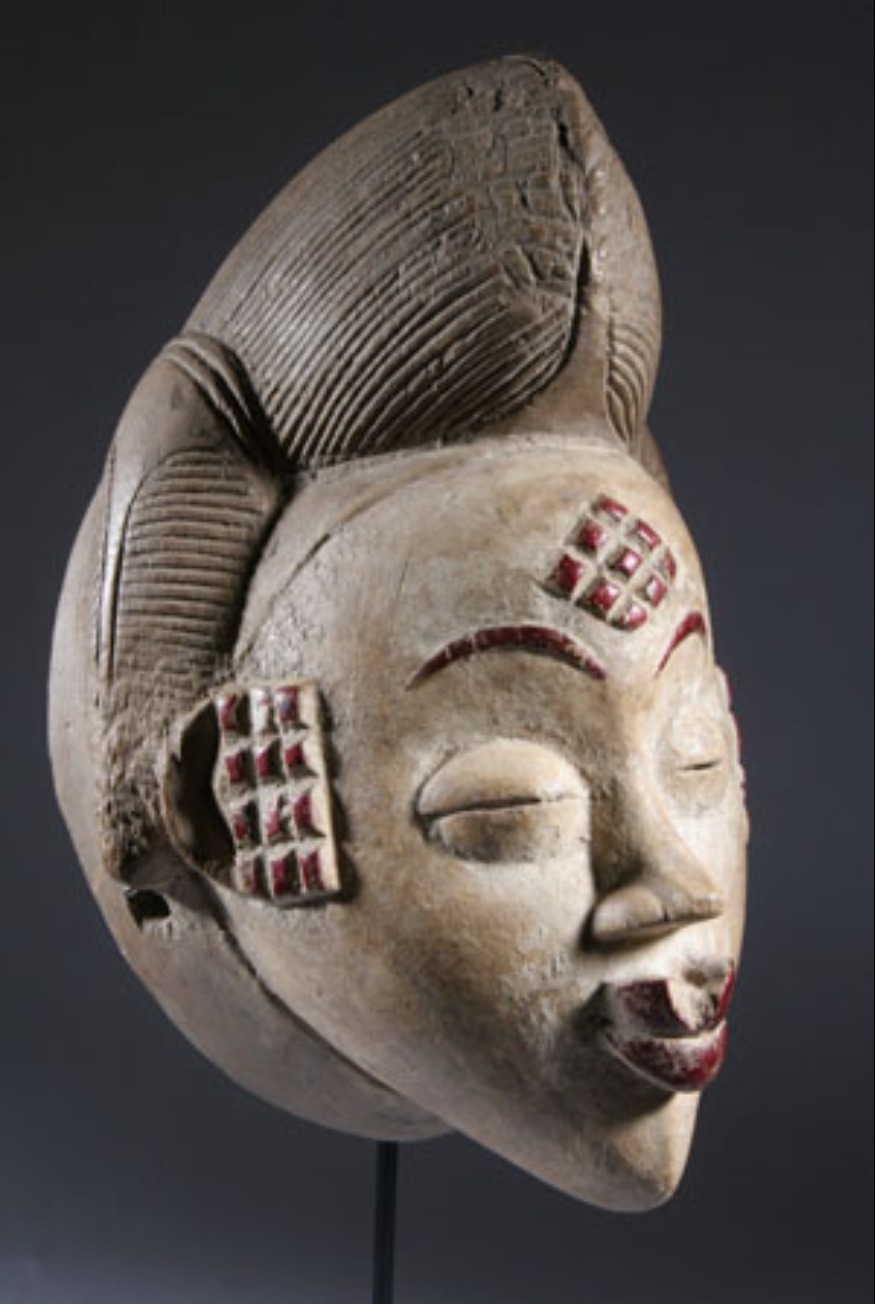 Le motif le plus courant, en forme d’écailles, comprend neuf losanges. Ce signe distinctif, nommé mabinda, était gravé dans la chair des enfants, vers l’âge de 10 à 14 ans. Les Punu vivent essentiellement au Gabon. Ils sont réputés pour la mystérieuse beauté de leurs masques avec leur face blanche peinte au kaolin et d’extrême finesse de leur trait.