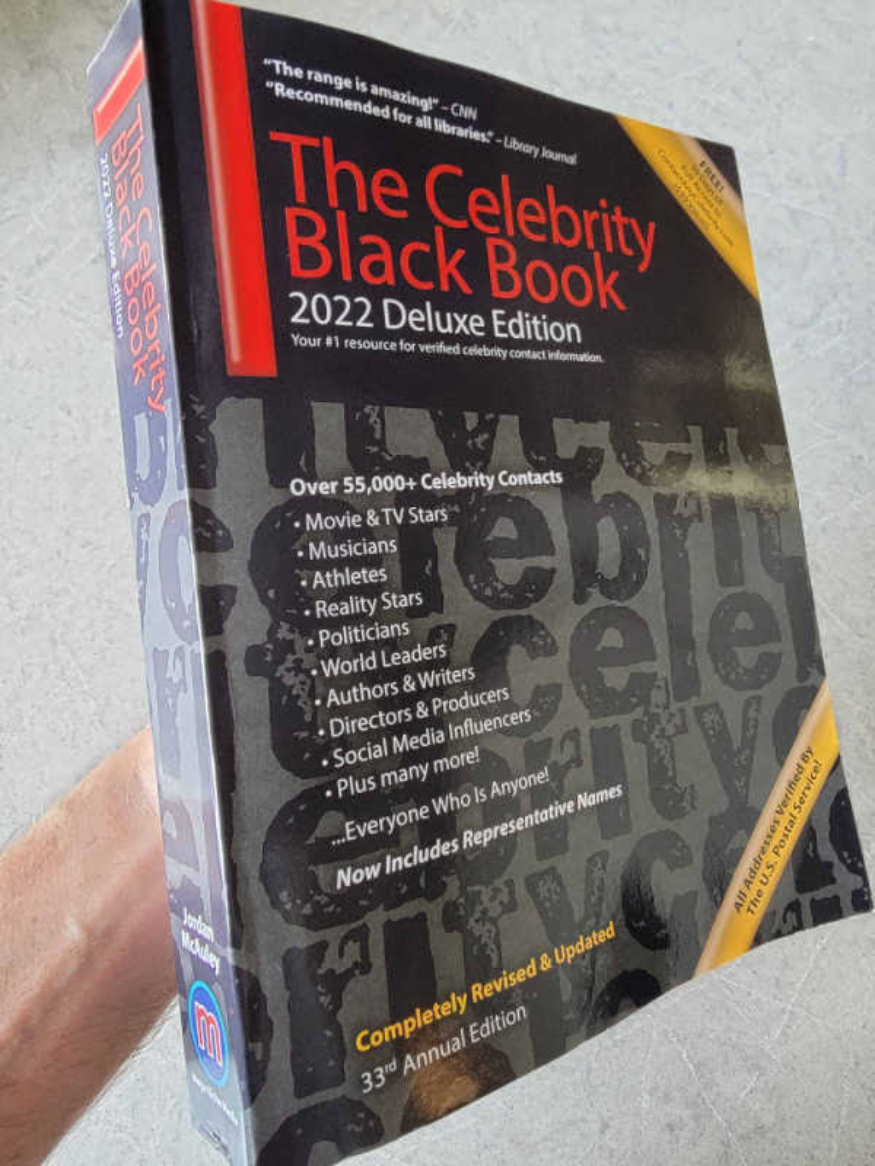 « The Celebrity Black Book 2022 » a tout ce dont vous avez besoin pour demander des photos de célébrités signées par courrier, organiser une vente aux enchères d'autographes de célébrités, mettre des produits entre les mains de célébrités et bien plus encore avec 55 000 adresses de célébrités vérifiées .