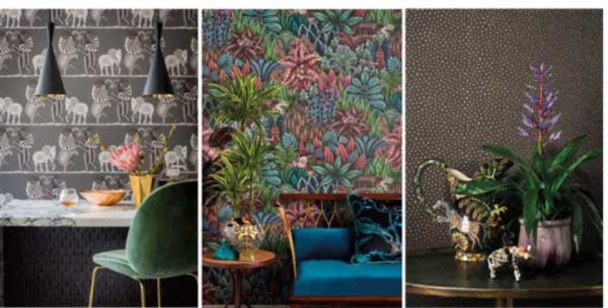 La fièvre de la jungle semble avoir conquis le monde de la décoration d'intérieur avec toutes sortes d'animaux sauvages ornant soudainement les textiles, les revêtements muraux et les objets décoratifs. Depuis plus de 30 ans, Ardmore, une entreprise de céramique africaine, a créé ses articles avec des motifs inspirés de la brousse, et ils se sont maintenant tournés vers le papier peint, après avoir lancé la collection Jabula en partenariat avec Cole & Son. Il y a 11 motifs dans la collection, chacun basé sur des motifs en céramique Ardmore. Les vedettes incluent Letaba March, représentant des animaux - léopards, guépards, girafes, éléphants et singes - se promenant jusqu'à leur point d'eau, la rivière Letaba, avec une option rendue sur un magnifique gazon texturé. Protea Garden représente des vignes grimpantes, mettant en vedette la fleur nationale d'Afrique du Sud, le roi Protea, parmi des colibris africains (appelés sunbirds) et des caméléons rusés.