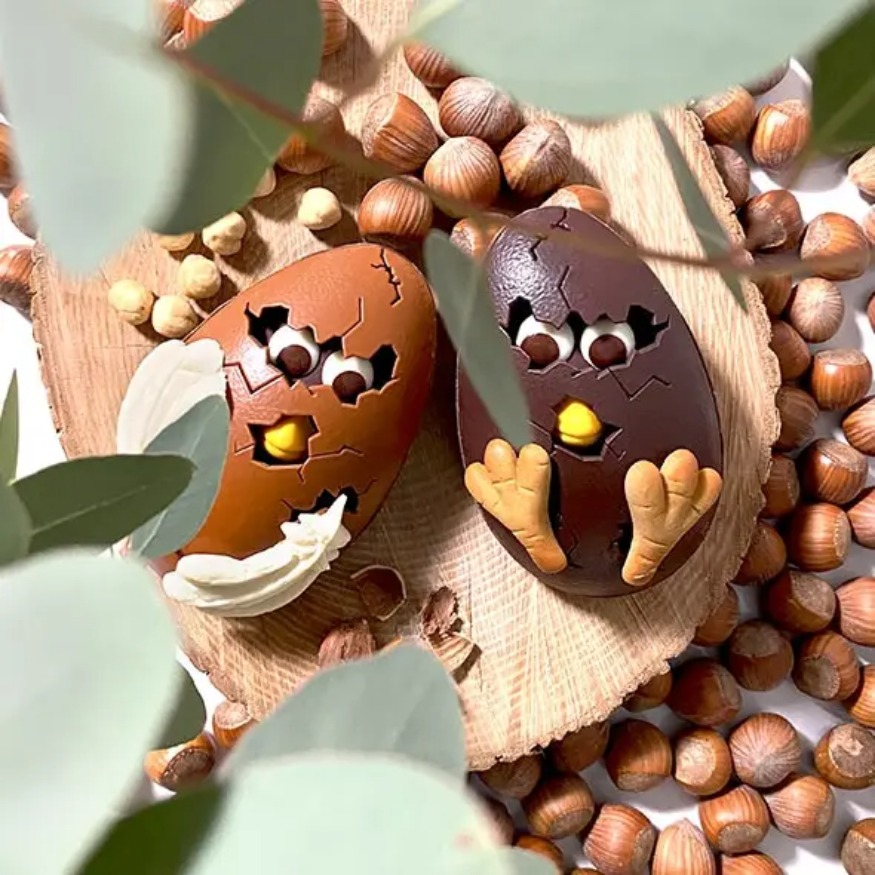 Les Poussins Craquants de Nicolas Cloiseau donnent du fil à retordre à bien des mères poules ! Tout juste couvés, leur nature chocolat noir dévoile l’énergie de poussins épris de liberté. Une patte par ici, une plume par-là, ils fendillent leur coquille avec entrain. On croque leur bouchée de chocolat au lait aux notes de caramel mêlée de noisettes hachées grillées, chahutée de perles craquantes de chocolat au caramel et de crêpe dentelle croustillante. Ça croque, ça craque à grand bruit !
